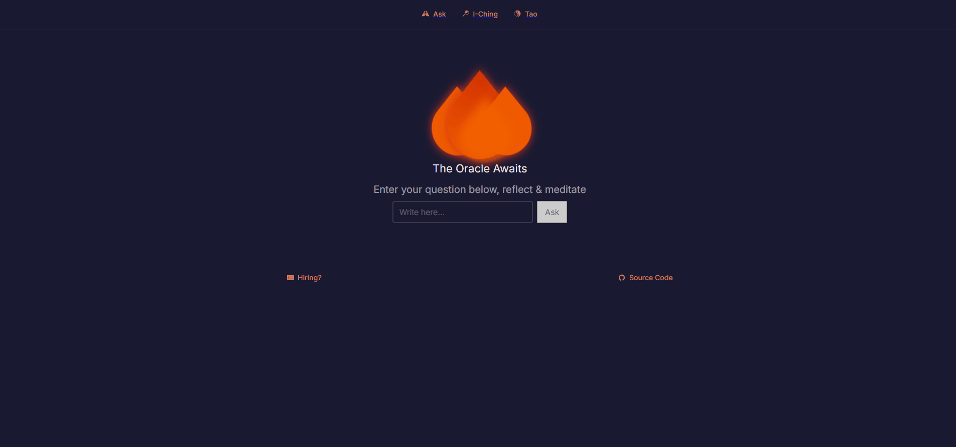 Built in a week, this is a representation of the Yi Jing, the Book of Changes, an oracular predictive system for reality which originated in China 3000 years ago. It uses the Yarrow Stick algorithm, one of the oldest if not the oldest algorithms in the world, and returns one of 64 hexagrams based on your question.